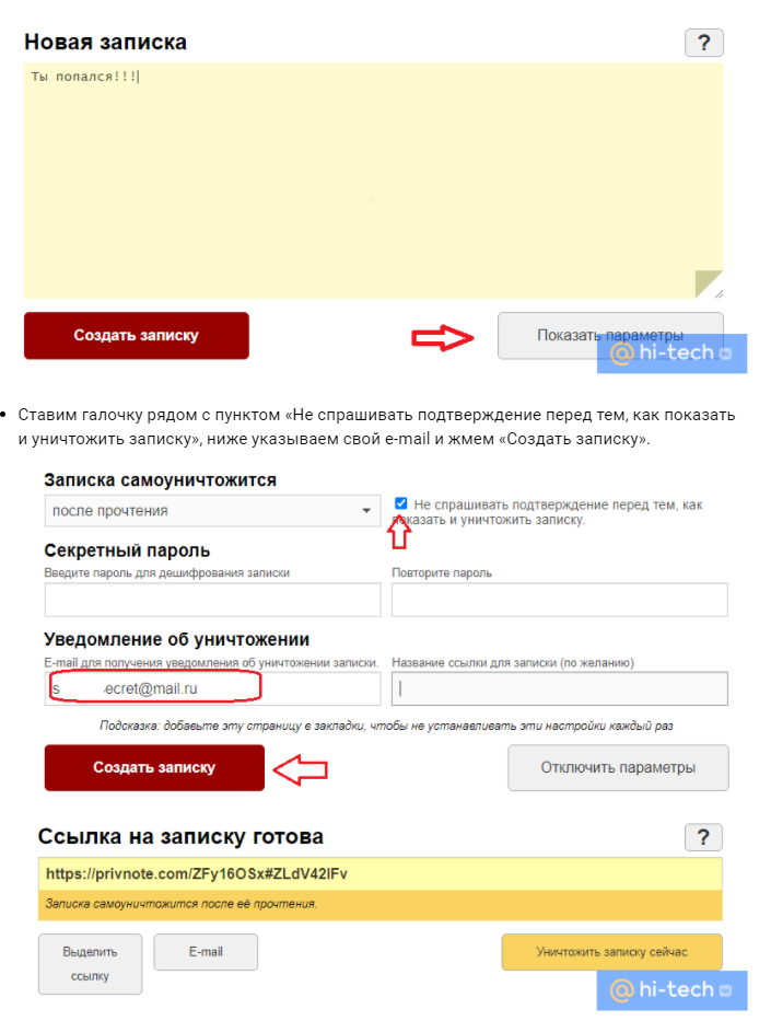 Благодаря данному сервису вы можете повысить свою приватность в переписке и быть уверенным, что, кроме вас и собеседника, никто не узнает подробностей ваших сообщений. Но главная его особенность состоит в другом. В параметрах при создании самоуничтожающейся записки вы можете указать свой e-mail и получать уведомления сразу после того, как записка окажется открыта. Эта фича нам и пригодится.