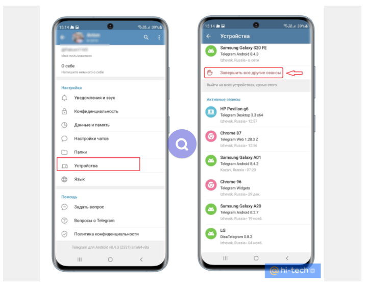 В Telegram для этого необходимо зайти в настройки и выбрать пункт «Устройства». Здесь будут отображены все активные сеансы с указанием устройств, локации и операционной системы. Любое из устройств вы можете отключить от аккаунта или же завершить сразу все активные сеансы одной кнопкой.
