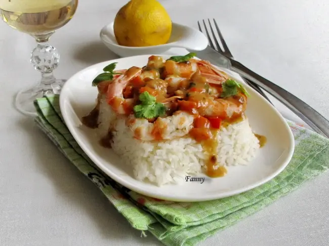 Рисовую запеканку вынуть из формы и выложить на блюдо. Поверх нее разложить лангустинов и полить их соусом.