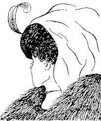 Молодая женщина стоит впол-оборота, на голове шляпа с широкими полями и пером.