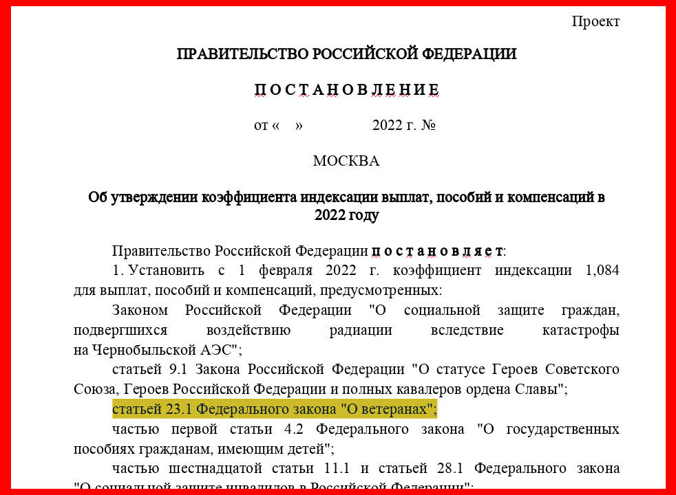 С 1 февраля 2022 года планируется повышение ЕДВ (ежемесячной денежной выплаты) ветеранам боевых действий. Согласно проекта Постановления Правительства РФ выплата будет увеличена на 8,4 процента и составит 3481,85 рублей. В данном документе индексации подлежат выплаты, пособия и компенсации, предусмотренные отдельными законодательными актами. В том числе в этот перечень входит Федеральный закон «О ветеранах». Ранее прогнозировались другие цифры — 5,8%.