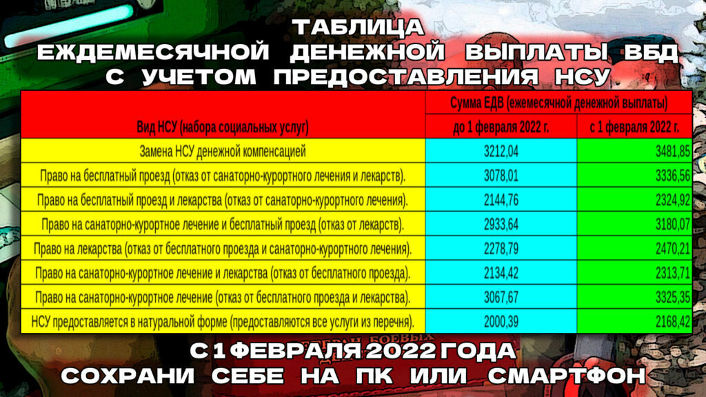 Право на лекарства (отказ от бесплатного проезда и санаторно-курортного лечения) до 31 января 2022 г. — 2272,78 руб. с 1 февраля 2022 г. — 2470,21 руб. Право на санаторно-курортное лечение и лекарства (отказ от бесплатного проезда) до 31 января 2022 г. — 2134,41 руб. с 1 февраля 2022 г. — 2313,71 руб. Право на санаторно-курортное лечение (отказ от бесплатного проезда и лекарства) до 31 января 2022 г. — 3067,67 руб. с 1 февраля 2022 г. — 3325,35 руб. НСУ предоставляется в натуральной форме (предоставляются все услуги) до 31 января 2022 г. — 2000,39 руб. Соответственно с 1 февраля 2022 г. — 2168,42 руб.
