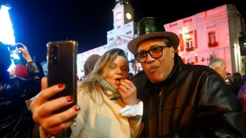 На центральной площади Мадрида Новый год встречали 7 тыс. человек - половина обычного числа. Перед полуночью зрители съедали по одной виноградине с каждым ударом часов.