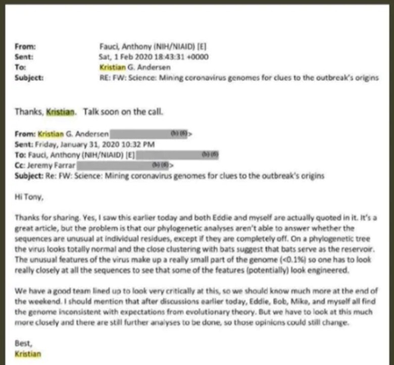 Однако — как мы знаем уже довольно давно — в это же самое время д-р Андерсон в частном письме сообщил главе NIAID д-ру Энтони Фаучи о том, что вирус может иметь лабораторное происхождение.