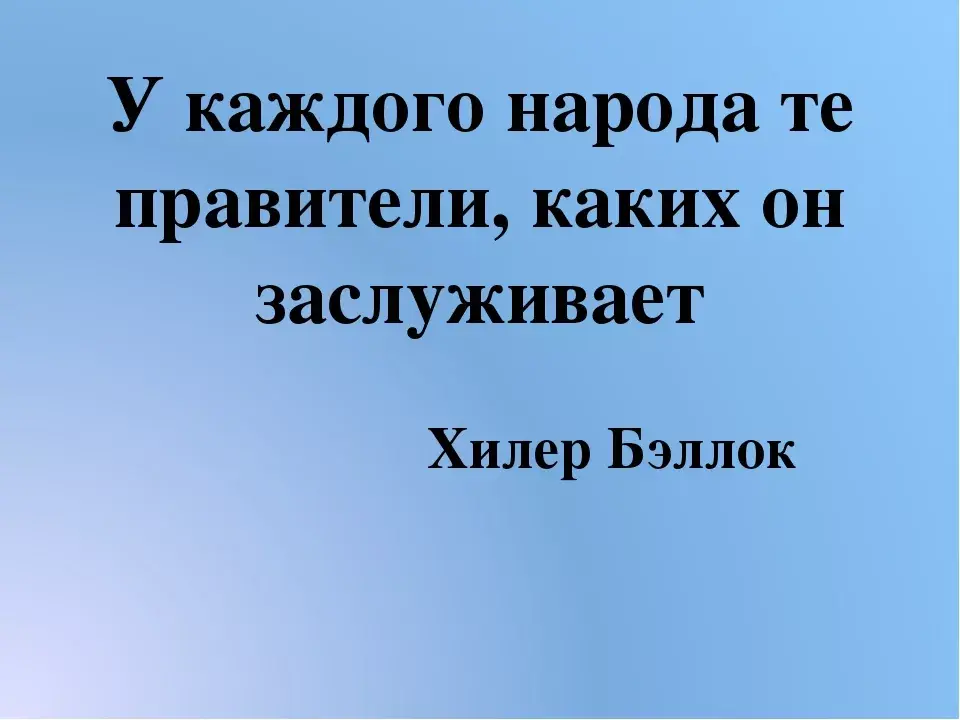 Как же ведут себя люди на примере моей матери и тещи, они получили уже пенсию, а дети и внуки, да и правнуки видимо их не волнуют, как они будут жить - дети, внуки и правнуки им получается не важно, страх поселенный в них однажды крепко держится и пустил корни...)))?! Эти люди ( большинство из них ), пойдут на все, они сделают, что им прикажут...)))?! Конечно не все, есть и другие и я в это верю, иначе получится так, как сказал Сократ, «Каждый народ достоин своего правителя», а в последствии эта фраза была произнесена не одну тысячу раз, может Мы так ведём себя, так поступаем, что заслужили именно то, что имеем, эта мысль никогда не приходила Вам в голову...)))?!