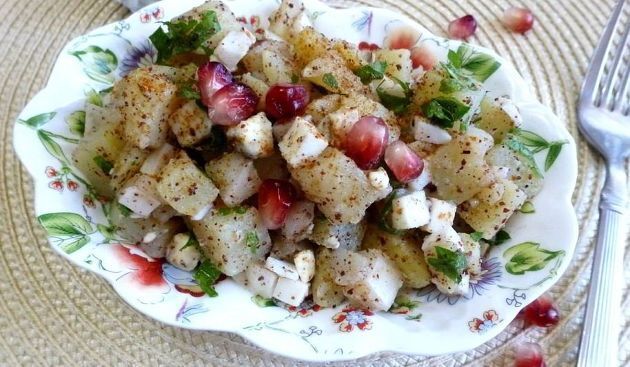 Ингредиенты простейшие: отварная картошка, яйца, щепотка перца, сумах, зелень, соль, растительное душистое масло. Зерна граната для украшения.