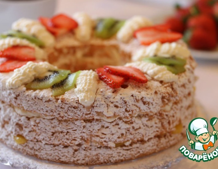 6. Накрыть вторым коржом, который смазать взбитыми с пудрой сливками. Накрыть третьим коржом. Обсыпать обильно пудрой. Украсить по своему вкусу. А можно не разрезать, а в середину в "дырку" выложить взбитые сливки или другой крем. Именно так чаще всего его и подают. Украсить клубникой, киви. Именно с клубникой и киви мне нравится этот десерт больше всего.