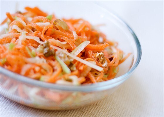 3. Смешать яблоко, морковь, апельсин, изюм и орехи (любые, ваши любимые), заправить соком и медом, добавить корицу.