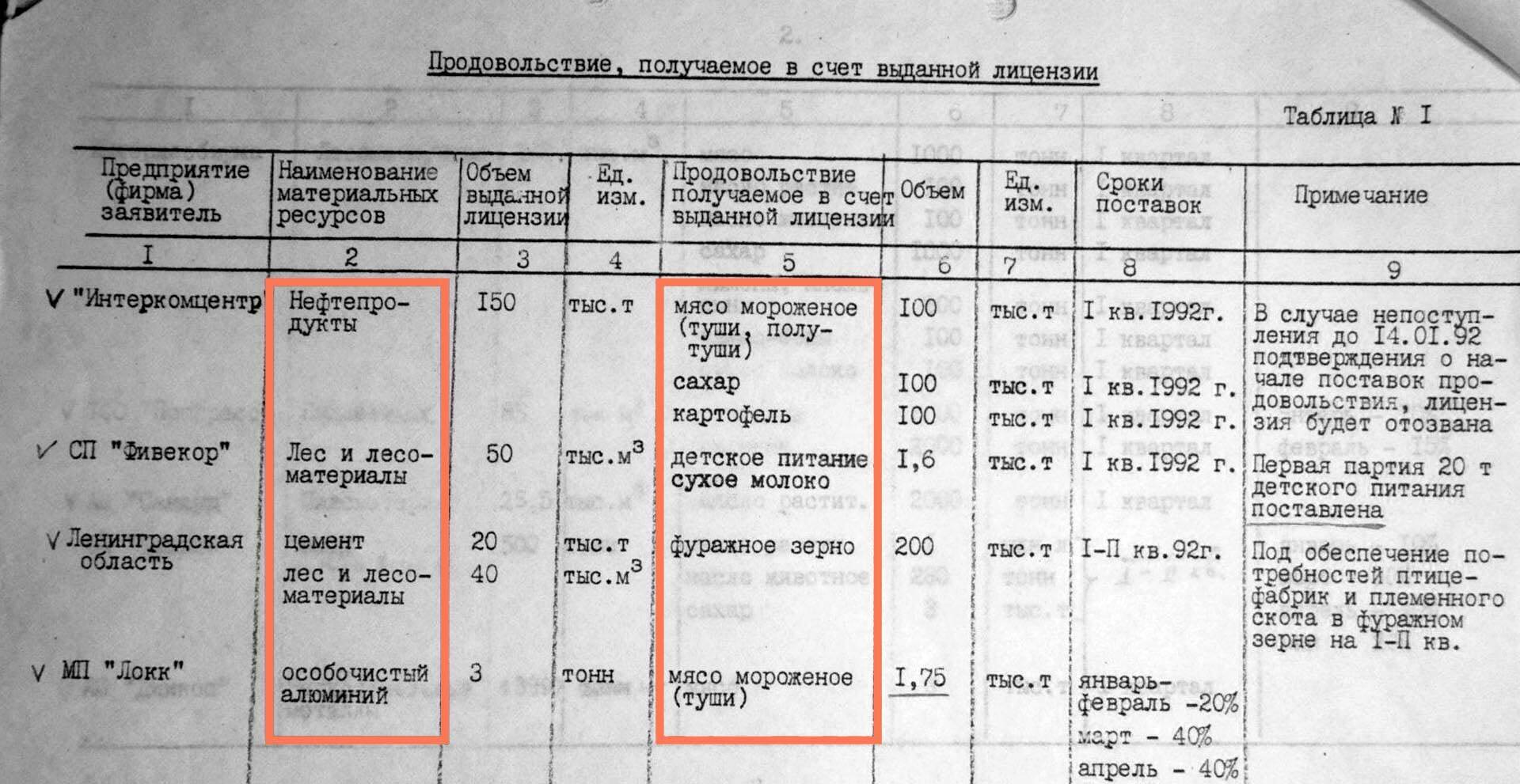 Самая известная и хорошо расследованная тема — экспортные лицензии. Путин занимался выдачей таких лицензий фирмам, которым разрешалось продавать нефтепродукты, лес, алюминий, медь, хлопок (любое сырье) за границу в обмен на еду. Буквально: нефть в обмен на сахар и картошку. Лес в обмен на детское питание.