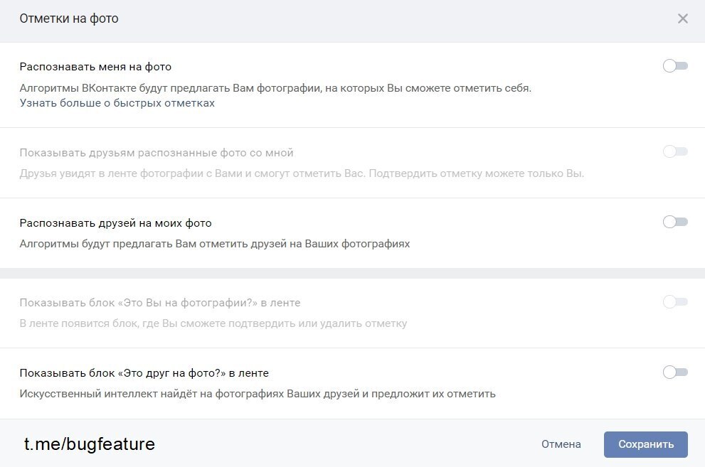 Замечу, что функцию "Показывать друзьям распознанные фото со мной" и "Показывать блок «Это Вы на фотографии?» в ленте" можно активировать только после включения первого пункта "Распознавать меня на фото".