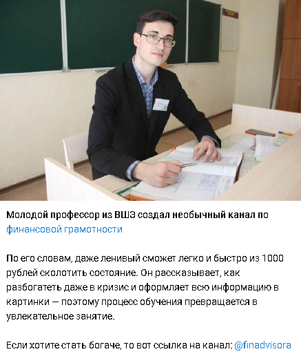 Пополнивший образование в США молодой профессор, ярый поборник проведённой в России пенсионной реформы, по словам Зюганова и других политиков, имеющий значительное влияние на правительство тогдашнего премьера Медведева и самого Путина, создал личный лохотрон - как легко из 1 000 рублей сколотить целое состояние.