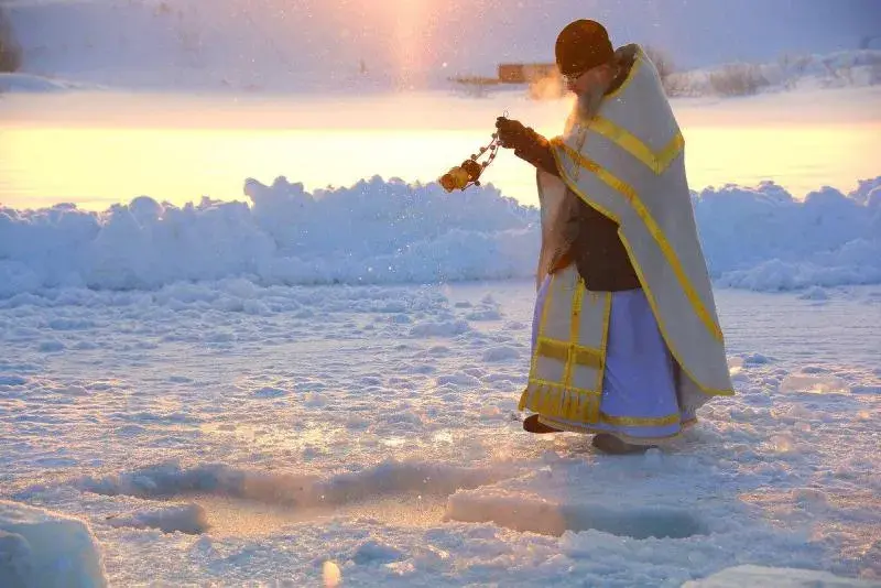 Важное событие Крещения Господня - водосвятие. На реке или на озере, во льду заранее вырубается полынья, называемая Иорданью. С наступлением полуночи священники освящают воду, и верующие окунаются в освященной воде.