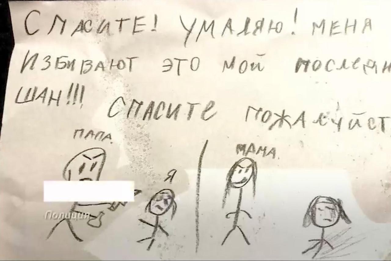 «Спасите! Умоляю! Меня избивают, это мой последний шанс», — было написано на листке бумаги детским почерком, с ошибками. Ниже были изображены плачущий ребенок, замахивающийся ножом на стоящего рядом подростка мужчина и женщина со злобной ухмылкой на лице. С обратной стороны были нарисованы два монстра, а также указан адрес, но без номера квартиры.