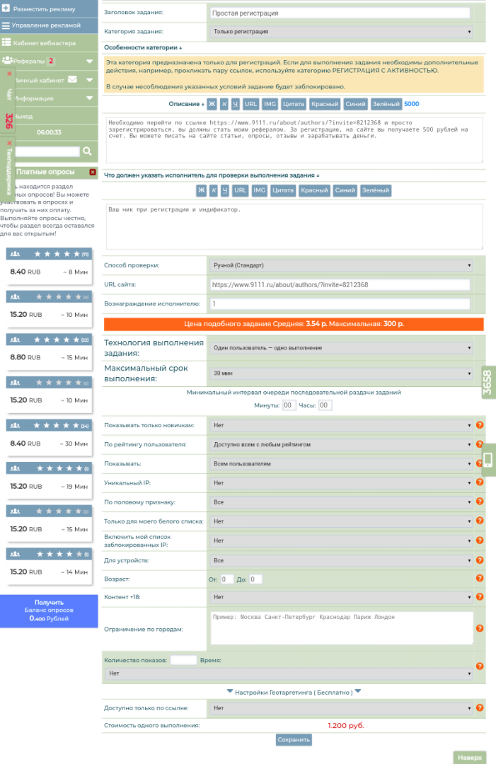 Вначале регистрируемся на этом сайте . После регистрации, в правой колонке кликаем по "Разместить рекламу", а в следующем окне кликаем по "Оплачиваемые задания" и заполняете в нём нужные поля. Образец на фото. Не забудьте поставить свою реферальную ссылку, на фото моя. Цену за выполнение ставьте на своё усмотрение, у меня 1 руб. Вы можете поставить и меньше, но учтите, исполнители предпочитают задания с более большой оплатой.