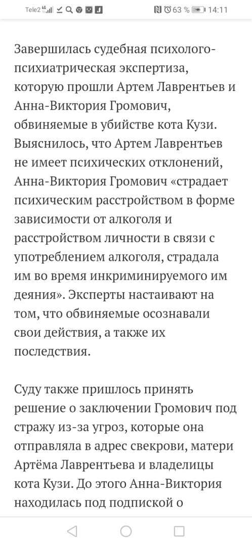 Стало известно, что Артема Лаврентьева и Анну-Викторию Громович, обвиняемых в пытках и убийстве кота, избили накануне второго судебного заседания по их делу. Об этом сегодня заявил сам Лаврентьев журналистам.