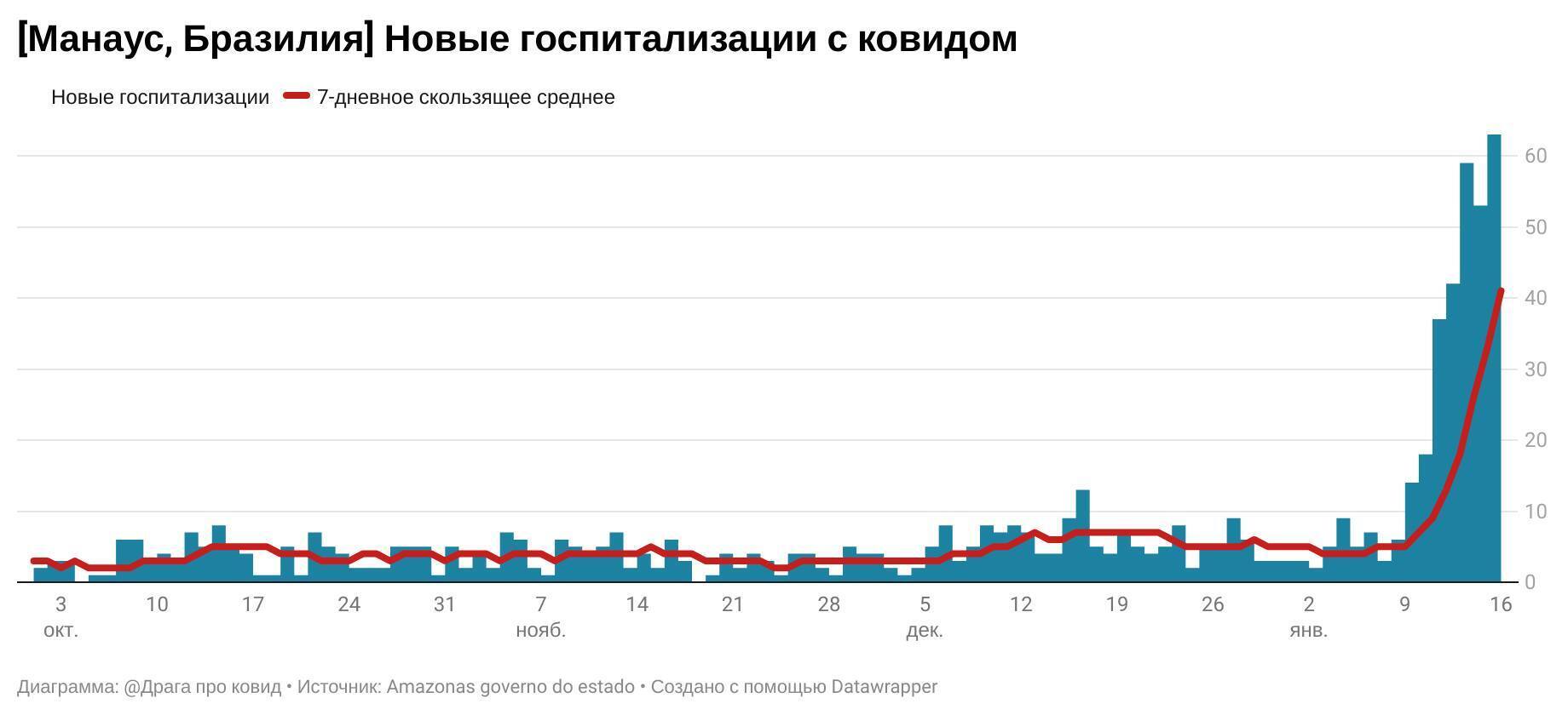 Ещё в первую декаду января в Манаусе госпитализировали в среднем по 4-5 человек в сутки. Всего за неделю скользящее среднее выросло в 10 раз — до 41. За прошлую неделю в Манаусе в больницы попало столько же человек с ковидом, сколько за два предшествующих месяца.