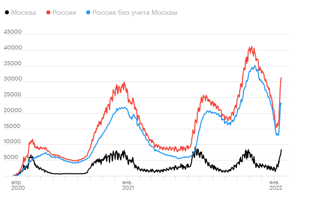 Горелов также отметил, что заграница перестала быть ключевым источником распространения инфекции, поскольку новый штамм активно циркулирует в России и появился в популяции. По словам эпидемиолога, омикрон-штамм постепенно вытесняет «дельту» в Москве, Московской области и Санкт-Петербурге, в то время как за Уралом ситуация «несколько иная». В связи с большей заразностью нового штамма Горелов ожидает шестизначные числа заболевших в сутки.