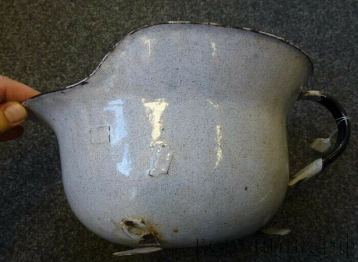 По сути, та же конверсия шлемов во что-то полезное, но только не централизовано на заводе, а силами отдельных граждан. Осуществляли домашнюю конверсию стальных шлемов как в Советском Союзе, так и в освобожденной от нацистов Германии. Предсказуемым и закономерным образом каски чаще всего переделывались в какую-нибудь тару.