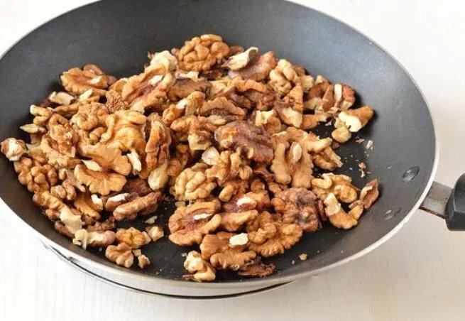 Орехи слегка обжарьте на сухой сковороде в течение 2-3 минут, а затем порежьте на кусочки.
