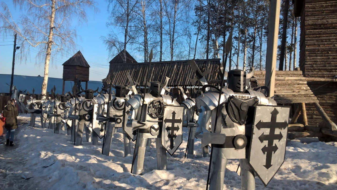 Пройдя сквозь ворота мы очутились на территории, по обеим сторонам которой рядами, молчаливо стояли скульптуры в полный рост, из металла, древние воины. Тут были пешие и воины на конях. Они были одеты в меховые накидки, латы и щиты были в руках.