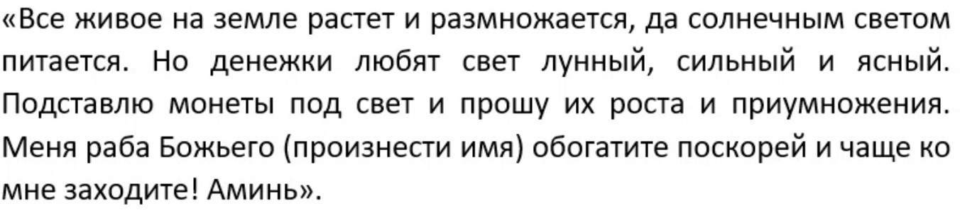 Найдите две крупные монеты, одна из которых будет золотой, а вторая - серебряной. Ровно во время Новолуния выйдите на улицу или балкон и покажите монеты полумесяцу, по монетке на каждой ладони, и произнесите наизусть магический текст: