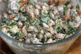На 1,5 стакана мелкой фасоли: 1 солёный огурец, 1 яблоко, 1 маленькая луковица, 200 г сметаны, 1 крутое яйцо, зелень петрушки; соль и перец по вкусу, 1 чайная ложка красного перца.