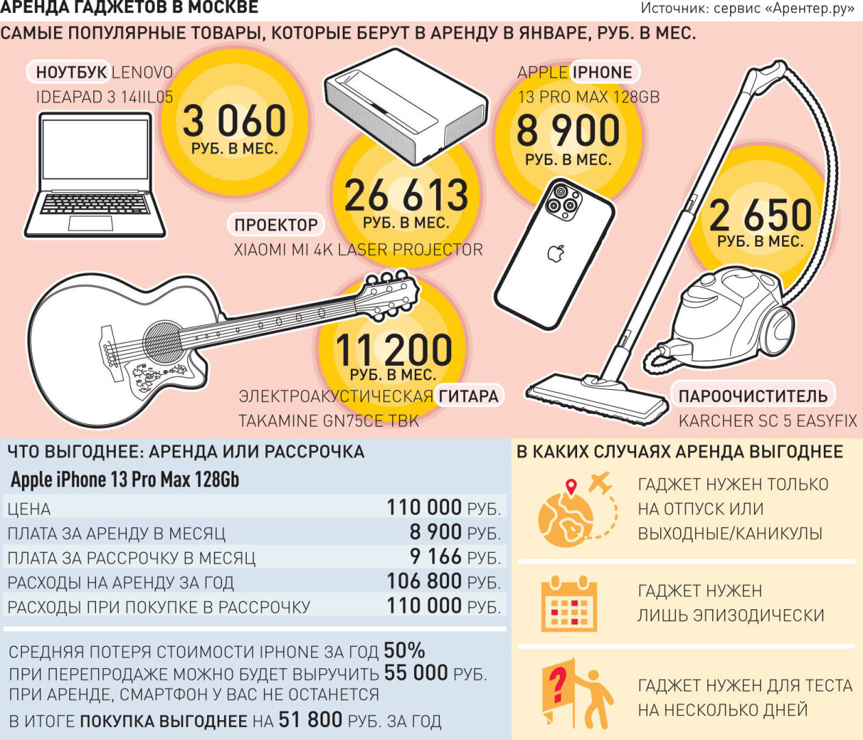 Можно больше не выкладывать по 100 тысяч рублей за новые iPhone и другие гаджеты: в Москве набрал популярность шеринг электроники. Как рассказали в компании "Арентер. Ру", в январе в аренду чаще всего брали ноутбуки, "яблочные" смартфоны и проекторы для домашнего кинотеатра.
