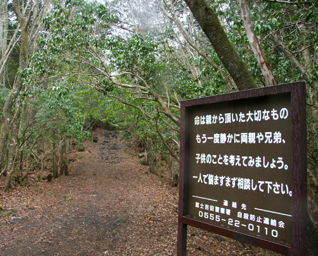 Перед самым входом на территорию Аокигахара, висит табличка приблизительного такого содержания: «Ваша жизнь является самым бесценным даром, который Вы получили от родителей. Подумайте о своей семье. Не страдайте в одиночестве, позвоните нам по телефону 22-0110 »