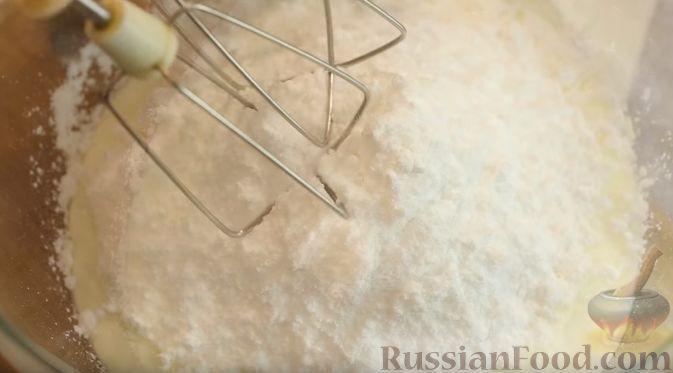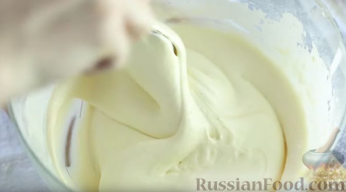 Пока печется медовик, готовим сметанный крем: взбиваем сметану и сахарную пудру.