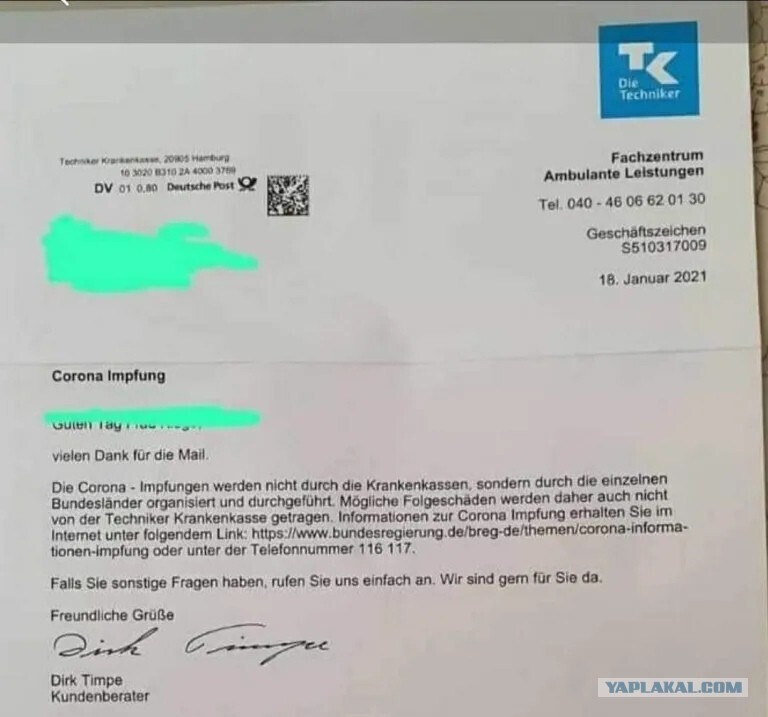 -"Суд признает классификацию страховщика, который юридически рассматривает участие в эксперименте третьей фазы, доказанная безвредность которого не установлена, как добровольное принятие смертельного риска, не предусмотренного договором, и юридически признается самоубийством, учитывая объявленные побочные эффекты, включая смерть. Семья подала апелляцию. Однако защита страховщика признается обоснованной и оправданной по договору, поскольку это публично известное принятие смертельного риска юридически считается самоубийством, поскольку клиент был уведомлен и согласился добровольно рискнуть смертью без каких-либо обязательств или принуждения"___________________Сообщения от читателей, которые уже имели или задокументировали подобный опыт:1. В этом случае частная страховка от несчастных случаев немецкой страховой компании сообщает клиенту, что, хотя применимые защитные прививки от известных инфекционных заболеваний, они НЕ застрахованы от вреда здоровью от вакцинации против Covid!2.В этом случае техник медицинской страховой компании также заявляет, что ущерб от вакцинации и другие последствия вакцинации против Covid НЕ застрахованы.