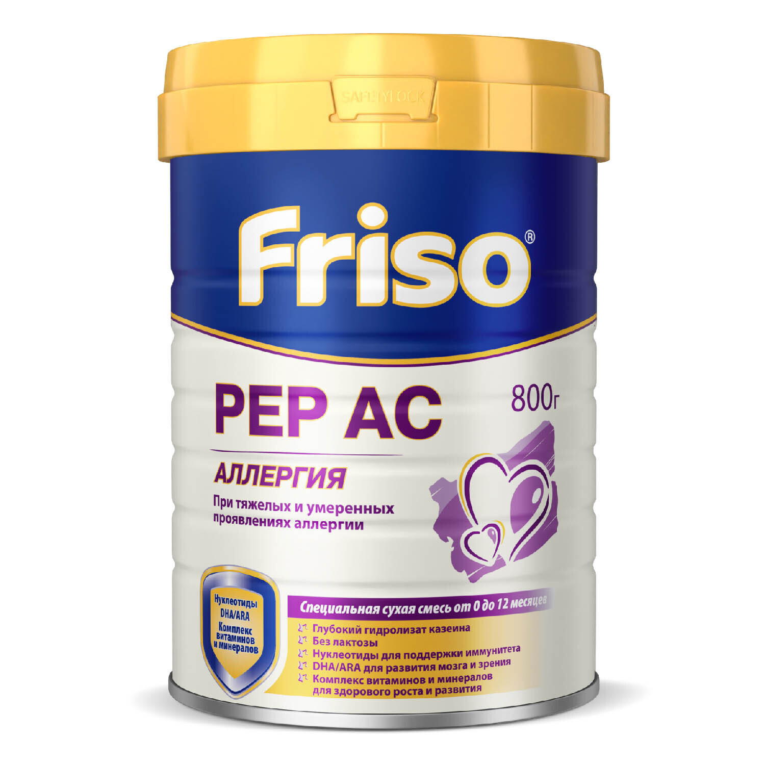 Непосредственно нам назначили смесь FrisoPep AC с глубоким гидролизатом белков казеина (около 2000 рублей за 800 г.), поскольку у малышки выявили аллергию на белок коровьего молока вследствие многочисленных попыток подобрать смесь. (Это были и Nan, и Similac, и Nutrilon, и даже Малютка).