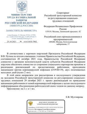 В документе работодателям рекомендуется предусматривать предоставление двух оплачиваемых выходных дней в коллективных договорах, локальных нормативных актах. Эти дни можно присоединить к ежегодным оплачиваемым отпускам, тем самым продлив отпуск на два дня. При этом данные дни также должны быть оплачены. Два выходных получат работники, прошедшие вакцинацию.