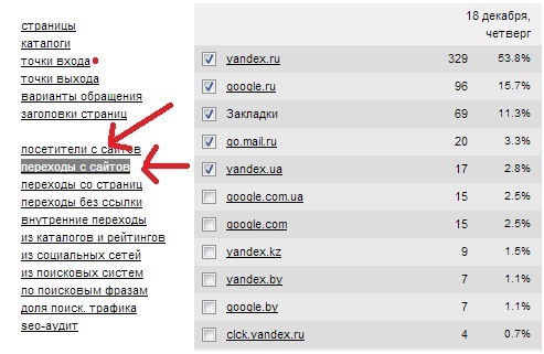 Если же в этом списке, когда сами будете проверять, увидите адреса каких то сайтов (не поисковых систем), перейдите на них и посмотрите, что это за сайты. Но это верный признак того, что трафик покупной. Хотя это могут быть переходя с баннеров, что маловероятно. Просто перейдите по этим ссылкам и проверьте там все баннеры, нажав на них.