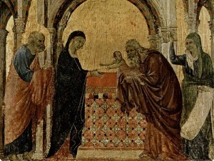 Евангелист Лука повествует о том, что когда Мария стояла в Храме с Младенцем Иисусом на руках, к ней подошел старец Симеон, известный в городе своей мудростью и праведностью. Увидев младенца Иисуса, он взял его на руки и произнес: «Ныне отпускаешь раба твоего, Владыко, по слову Твоему, с миром; ибо видели очи мои спасение Твое, которое Ты уготовал перед лицем всех народов, свет к просвещению язычников, и славу народа Твоего Израиля» (Лк. 2:29-32).