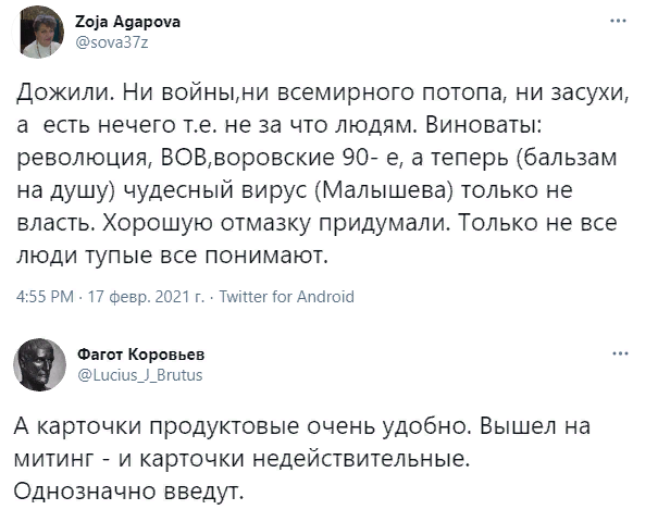 Ну а тем временем в соцсетях цитаты из Госдумы на тему карточек на еду для бедных уже разошлись на мемы, россияне вспоминают и голодные 90-е, и Вторую мировую войну, и Голодомор.