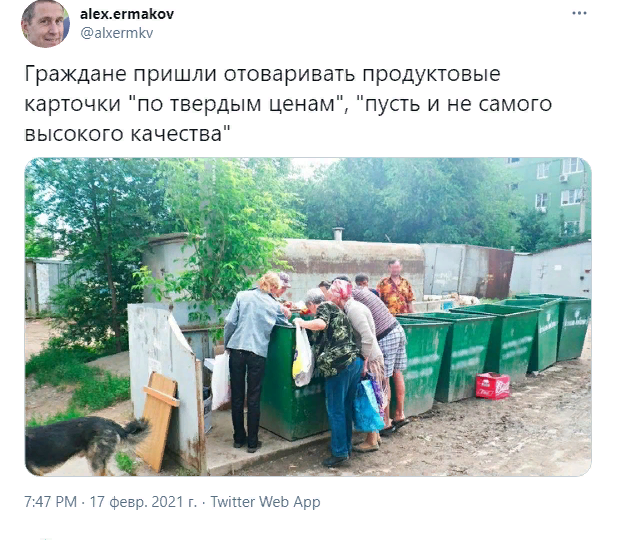 Ну а тем временем в соцсетях цитаты из Госдумы на тему карточек на еду для бедных уже разошлись на мемы, россияне вспоминают и голодные 90-е, и Вторую мировую войну, и Голодомор.