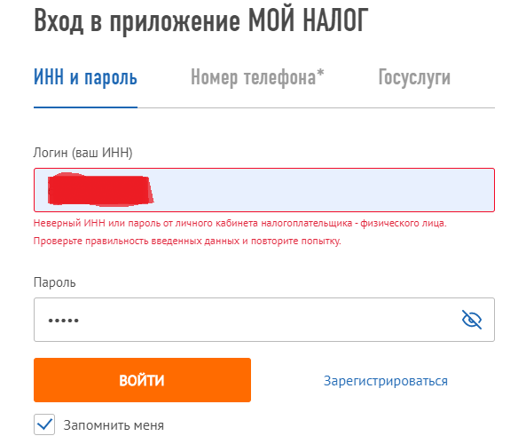 "Неверный ИНН или пароль от личного кабинета налогоплательщика - физического лица. Проверьте правильность введенных данных и повторите попытку. "