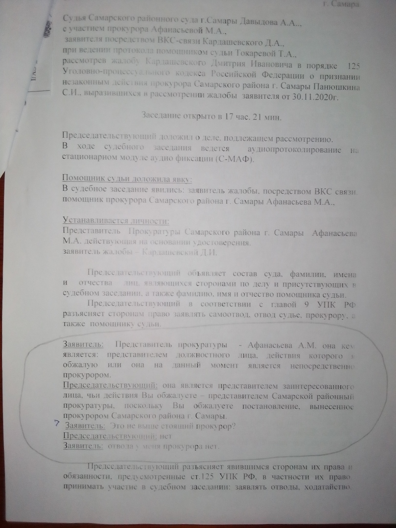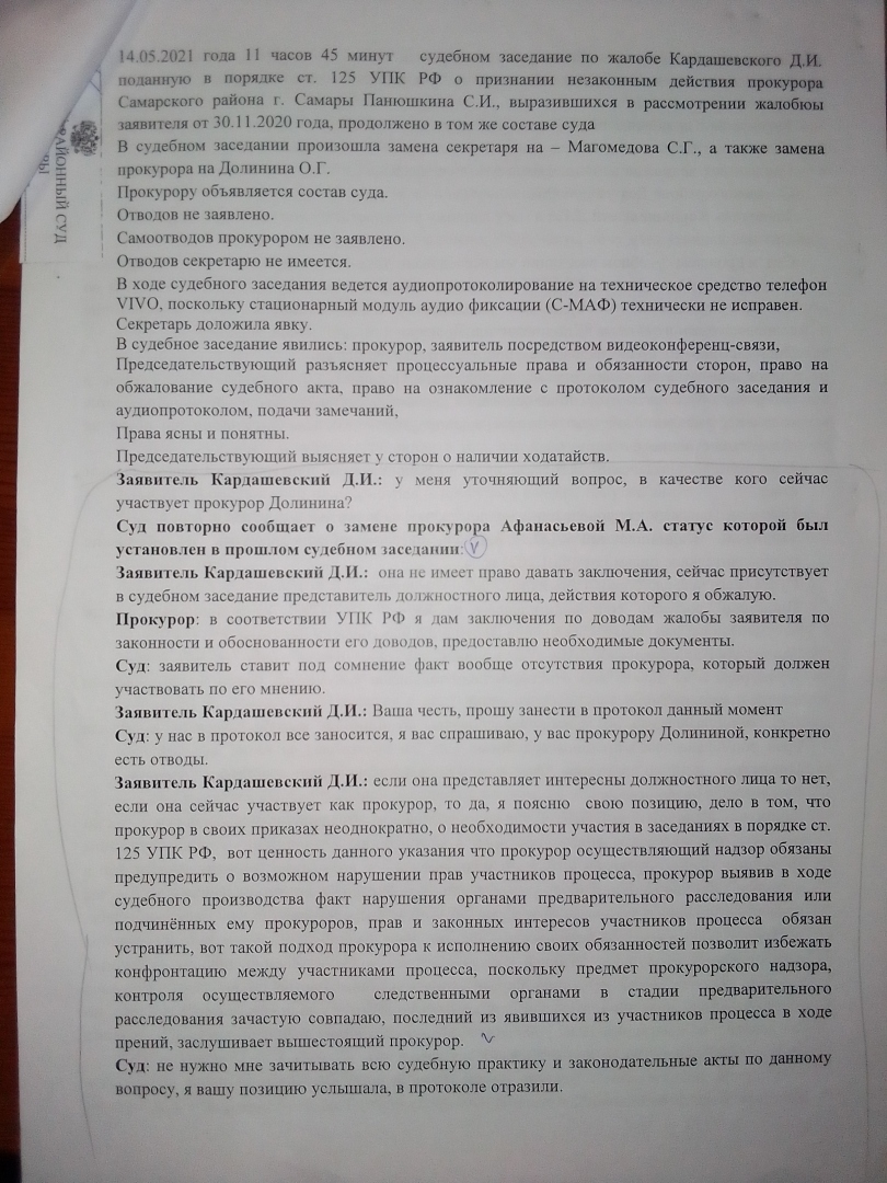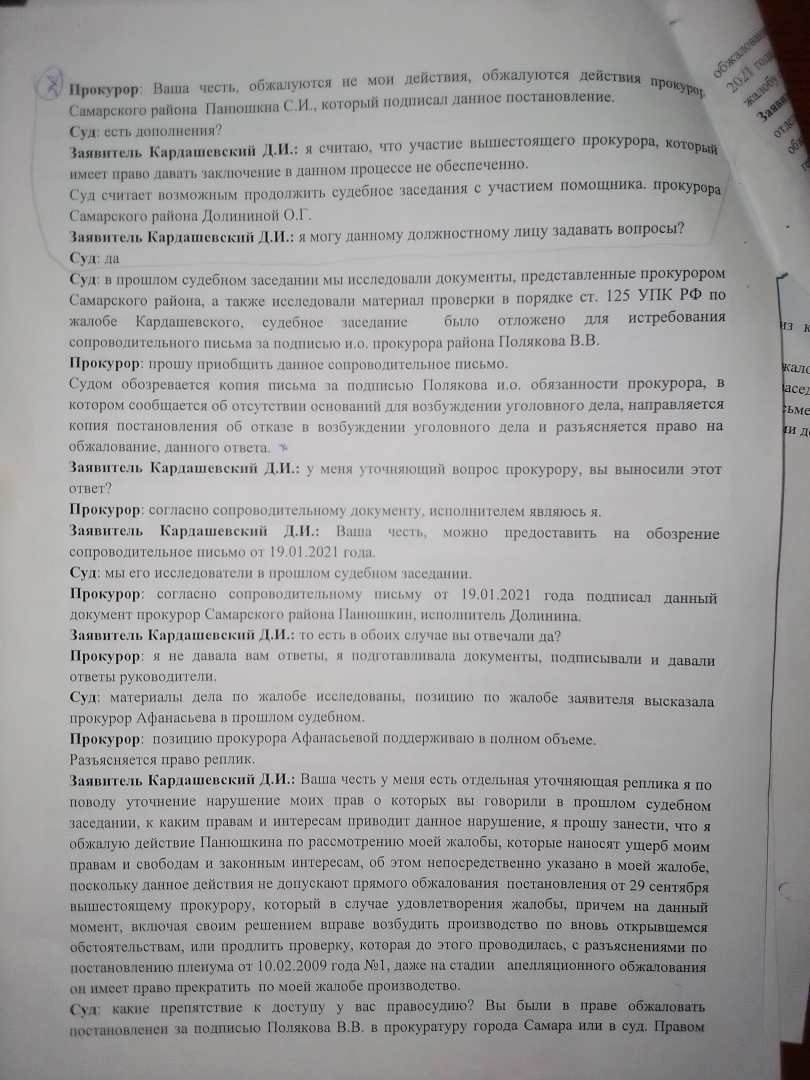 Несколько раз я обжаловал в суд действие (бездействие) и решения прокурора района в порядке ст.125 УПК РФ. В судебных заседаниях при этом участвовала представитель прокуратуры района - помощница прокурора района,а также я,судья и секретарь.
