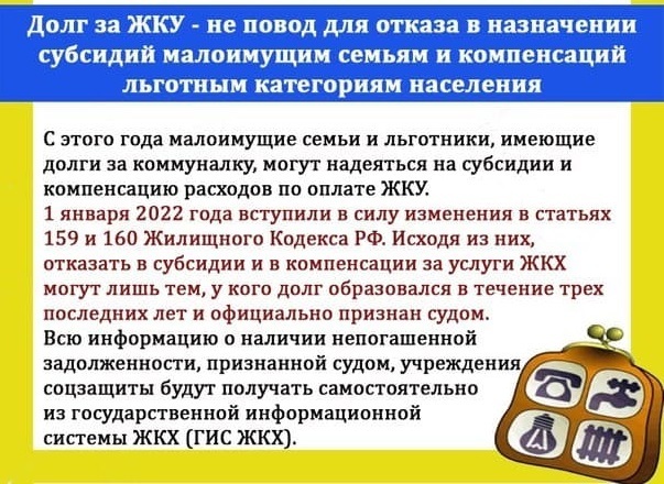 С 1 января 2022 года изменятся правила предоставления субсидий на оплату жилого помещения и коммунальных услуг. Теперь компенсацию таких расходов не смогут получать граждане, задолженность которых по оплате жилых помещений и ЖКУ подтверждена вступившим в законную силу судебным актом.