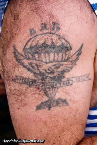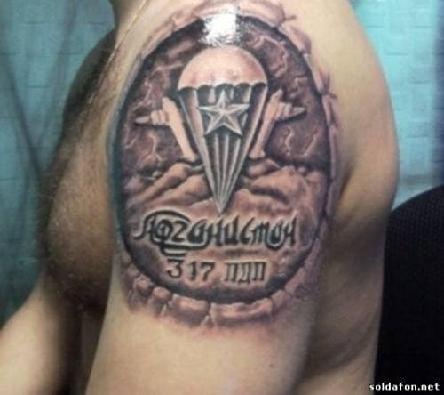 Традиционная наколка десантников (парашют, крылышки) дополнялась информацией о месте службы.