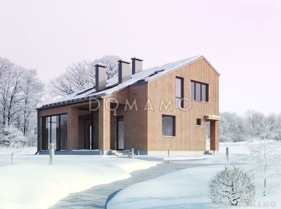 Оригинальность фасаду придает оформление стен деревянной вагонкой в вертикальном направлении, а также асимметричная двускатная крыша.