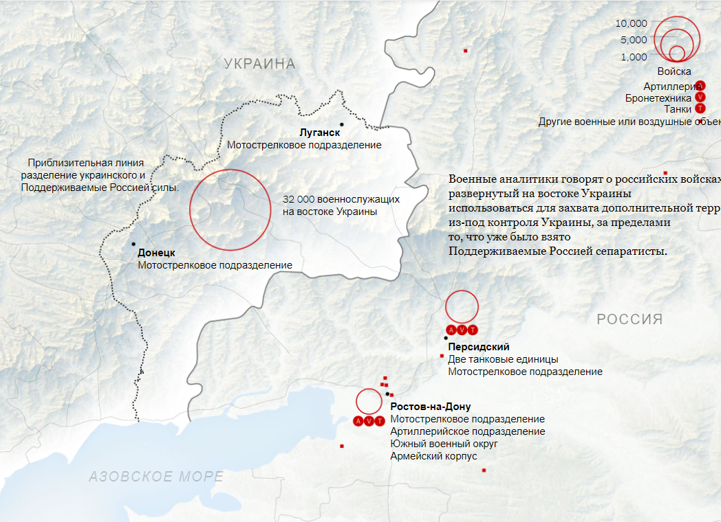 Карты представляют собой снимок российских позиций, а также общие оценки численности войск и видов техники, развернутой в пределах досягаемости Украины. Он основан на информации, полученной украинскими и западными официальными лицами, а также независимыми военными аналитиками и спутниковыми снимками.