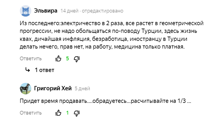 Один мужчина вспомнил печальный опыт своих знакомых, которые раньше имели в Турции свое жилье, но затем лишились его. Комментатор завуалировано обвиняет в этом турецкие власти и предостерегает россиян, что те не «велись на дешевизну» и отказывались от покупки турецкой недвижимости, чтобы в будущем не остаться без всего.