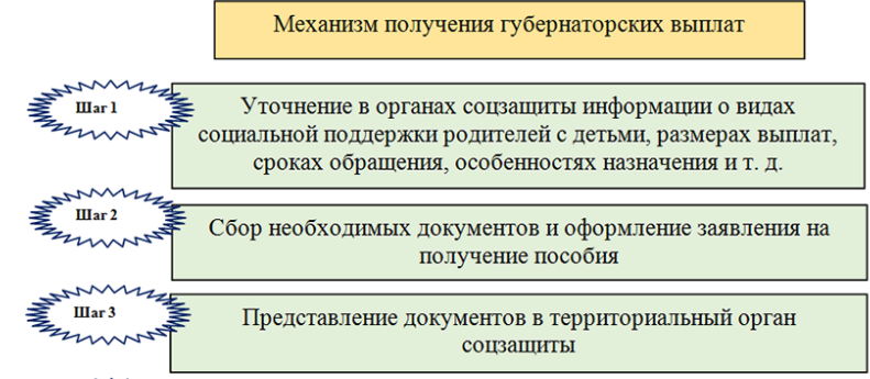 Для получения выплаты в органы соцзащиты необходимо представить заявление и подтверждающие документы (свидетельство о рождении ребенка, удостоверение личности получателя и др.). Конкретные размеры губернаторских выплат, порядок их получения и точный список необходимых документов уточняйте в органах соцзащиты по месту жительства. Они выплачиваются из регионального бюджета, если на данной территории действует соответствующий нормативный акт.
