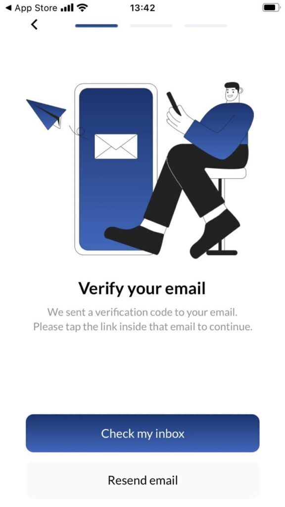 Проверяем почтовый ящик и в письме от приложения жмем кнопку Verify Email Now. Если не пришло — проверьте раздел спам. После подтверждения почты закрываете приложение и заходите в него заново указывая вашу почту (логин) и пароль. В некоторых смартфонах есть кнопка Continue рядом возле кнопок Check my inbox и Resend email, можно нажать её и зайти сразу в приложение.