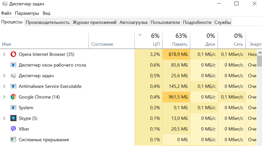 На примере ниже на компьютере два браузера по 5 вкладок, Skype, Viber и уже занято 63% памяти. Остальные процессы заняты службами Windows. Если я запущу программу для работы с документами, то память будет практически занята.