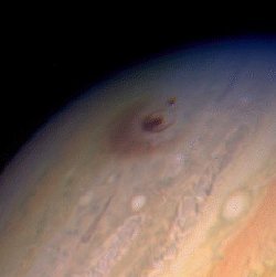 На этой фотографии запечатлено падение метеорита или же кометы, которая оставила достаточно большой след на Юпитере. Эта фотография была сделана в 1993 году.