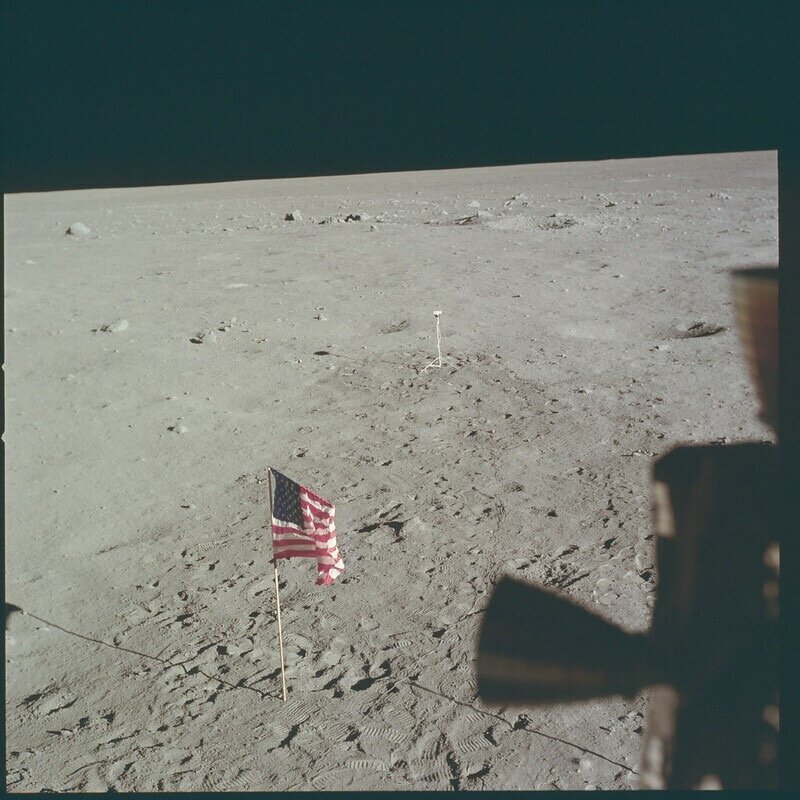 Это фото флага, сделанное под конец посещения Луны из окна посадочного модуля. У космонавтов оставалось ещё много пустых кадров, поэтому они добивали плёнку, наделав много однотипных дублей. Увеличим изображение и посмотрим на флаг.