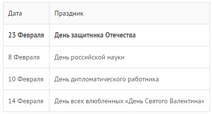Первые длительные праздничные выходные россияне уже отгуляли. Следующие затяжные «каникулы» ждут огромную страну лишь в мае, но огорчаться не стоит: ведь в феврале нам удастся также отгулять праздничный выходной — он будет связан с празднованием Дня защитника Отечества, который всегда отмечается 23 февраля.