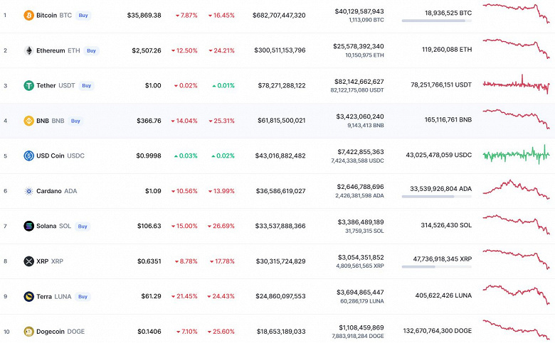 Bitcoin и Ethereum продолжают катиться вниз. Главная криптовалюта мира уже дешевле 36 000 долларов